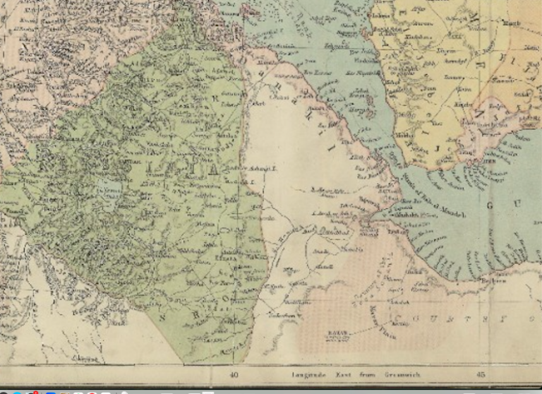 Crop of 1885 Map of Egypt and the Soudan, including the valley of the Nile, the Red Sea, Abyssinia, Arabia, etc. Note that the Abyssinian Empire had not yet incorporated the territories that now constitute much of southern, western and eastern Ethiopia – ie. Oromia, Southern Nations, Nationalities and Peoples, Ogaden and Harar Source: Royal Geographical Society (with IBG)