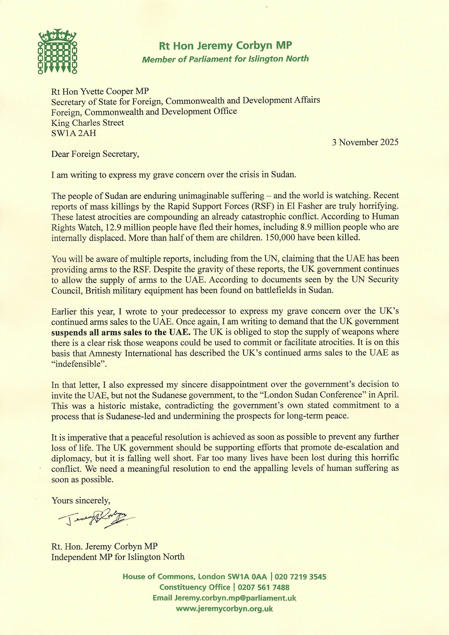 I have written to the Foreign Secretary demanding the suspension of arms sales to the UAE.