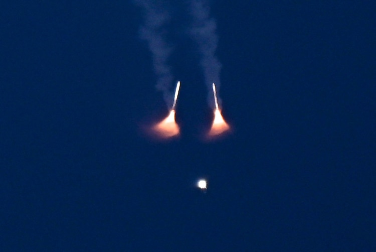 The Space Launch System rocket carrying NASA's Artemis II Orion crew capsule ascends after liftoff, with its solid rocket boosters already detached, from the Kennedy Space Center in Cape Canaveral, Florida, April 1, 2026.