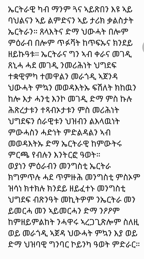 kerenite wrote: ↑23 Jun 2020, 15:02In my opinion, this famous tegedlay has joined the agazian camp and disrupting his legacy. Perhaps convinced by letetsion or by the 88 years old habtemariam who suffers from alzheimer.