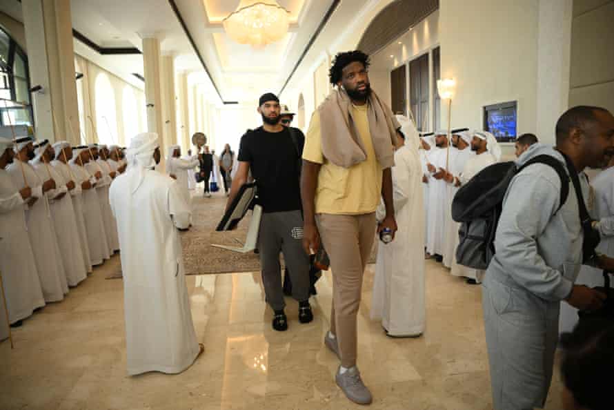 Joel Embiid of the Philadelphia 76ers arrives at the hotel for the team’s visit to Abu Dhabi this year. Photograph: David Dow/NBAE/Getty Images