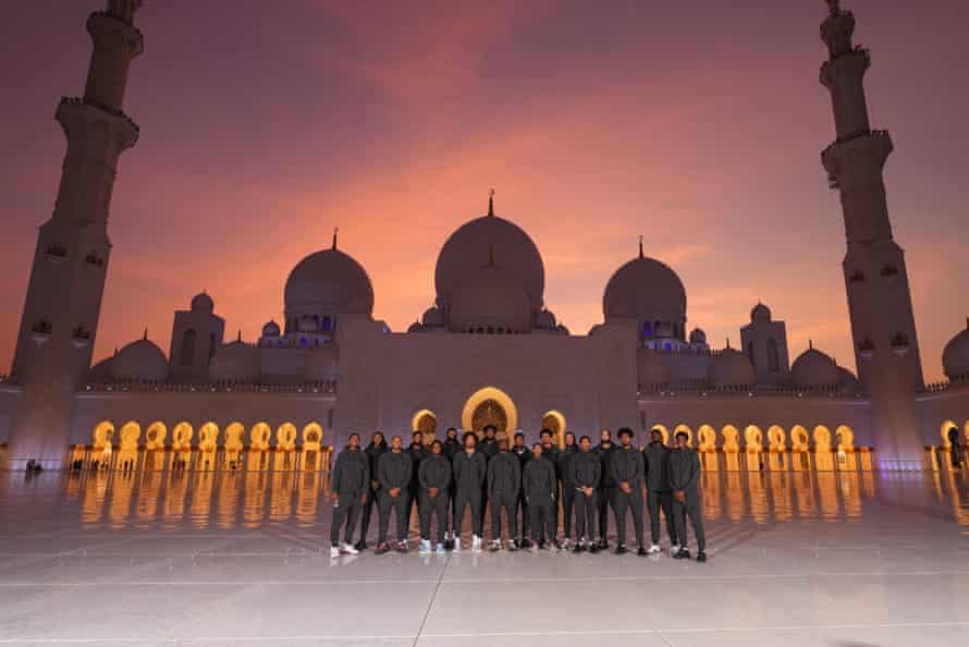 The Philadelphia 76ers takes a team photo at the Sheikh Zayed Grand Mosque as part of their NBA Global Games visit in Abu Dhabi in September. Photograph: Jesse D Garrabrant/NBAE/Getty Images